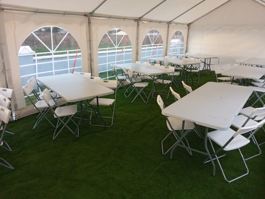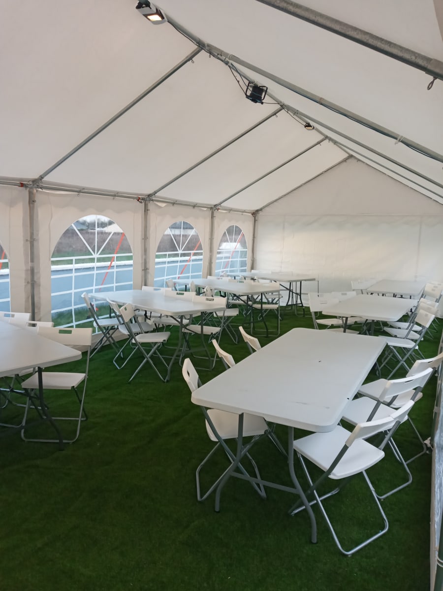 ✨ Our marquee package includes everything you need to create a memorable event. Along with the marquee itself, we provide tables and chairs, allowing you to set up a stylish seating arrangement for your guests. We also offer an artificial grass floor, bringing a touch of elegance to your event's ambiance.