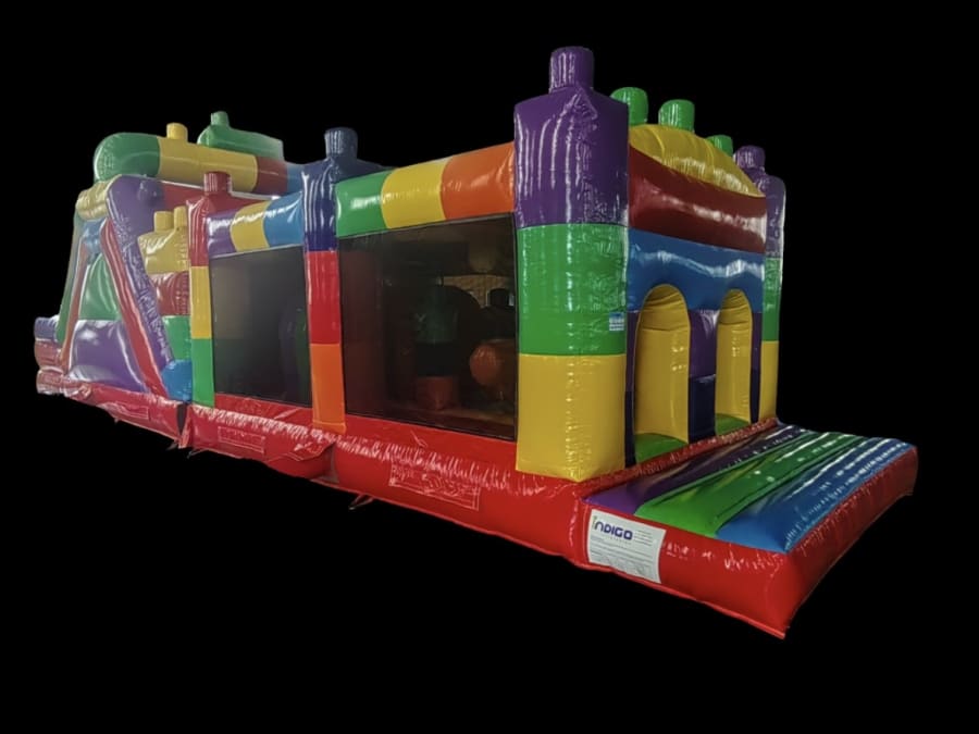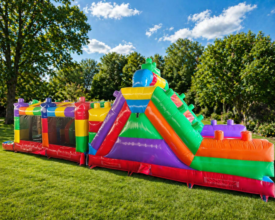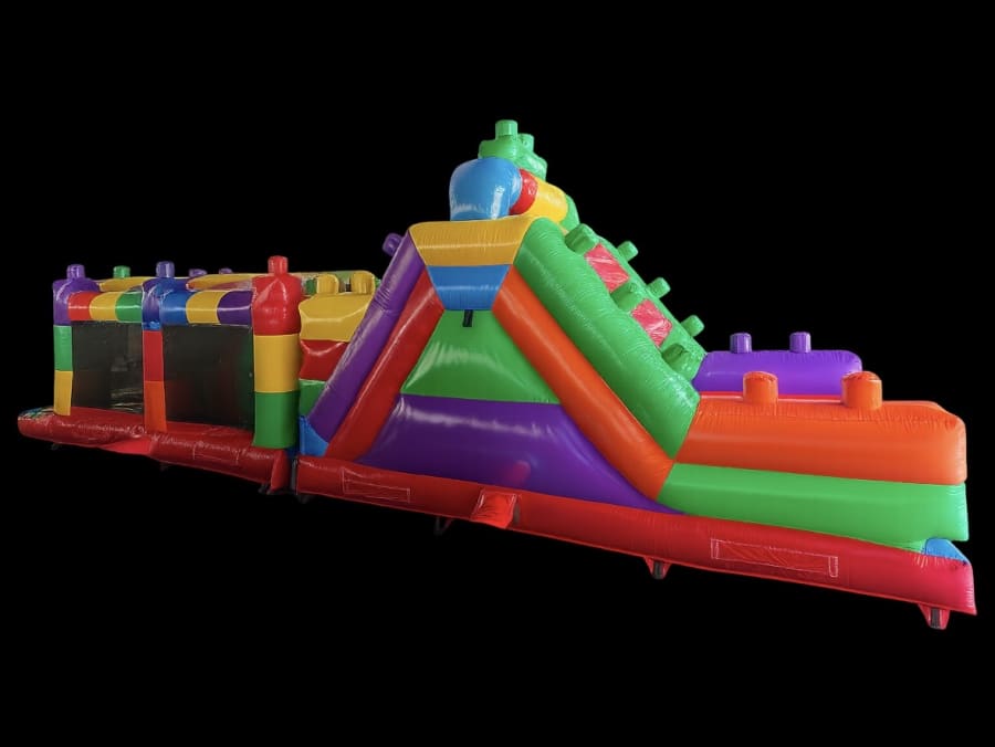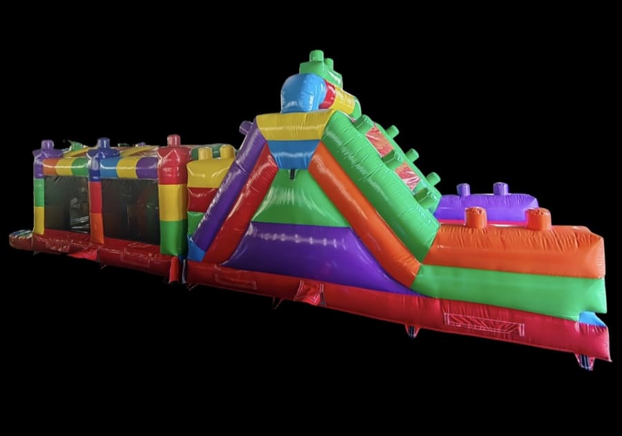 This large 45ft obstacle course is designed in a bright building-block style that kids instantly love. Participants race through pop-ups, squeeze sections and obstacles before finishing with a fast slide at the end – making it ideal for energetic parties and competitive fun.